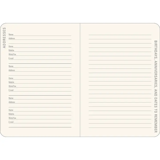 • Extra pages in the back to record information about your contacts and to note important dates